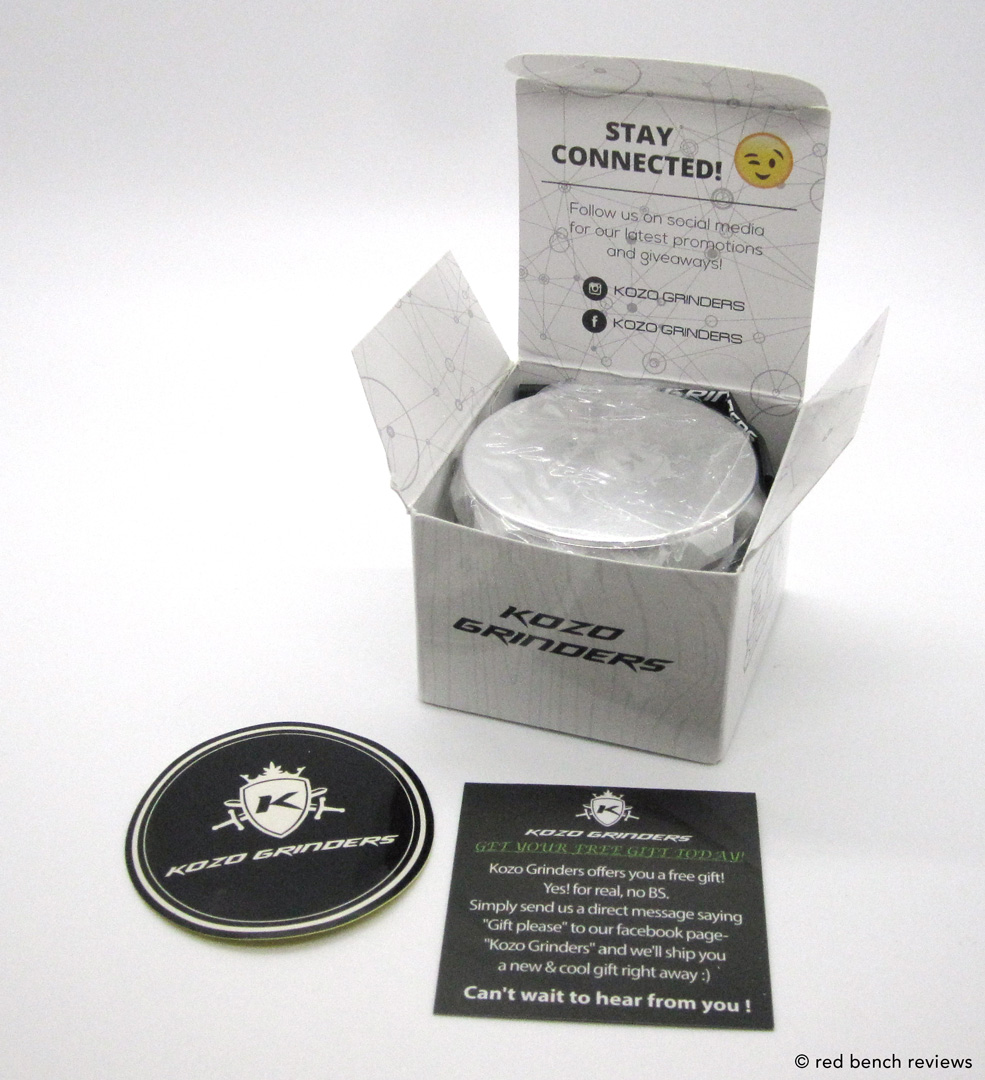 The grinder arrived in the mail and was packaged in a small box, just large enough to hold the grinder (wrapped in plastic), a sticker, and a small, smell-proof travel bag to transport the device.