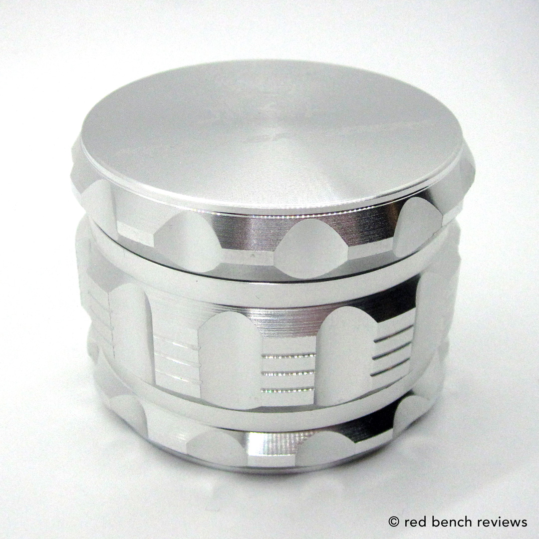 The compartment below, which is roomy enough to hold a decent quantity of herb, has a mesh screen at the bottom so kief, the loose trichomes, can fall through and be collected in the base of the grinder. The whole device is crafted from heavy-duty aluminum and seems to be very solid and well-made. The pieces fit together in an intuitive fashion and it took me less than a minute to understand how the four pieces fit together. The outside of the grinder has good hand grips and the operation of the machine is very smooth – the pieces fit together perfectly.